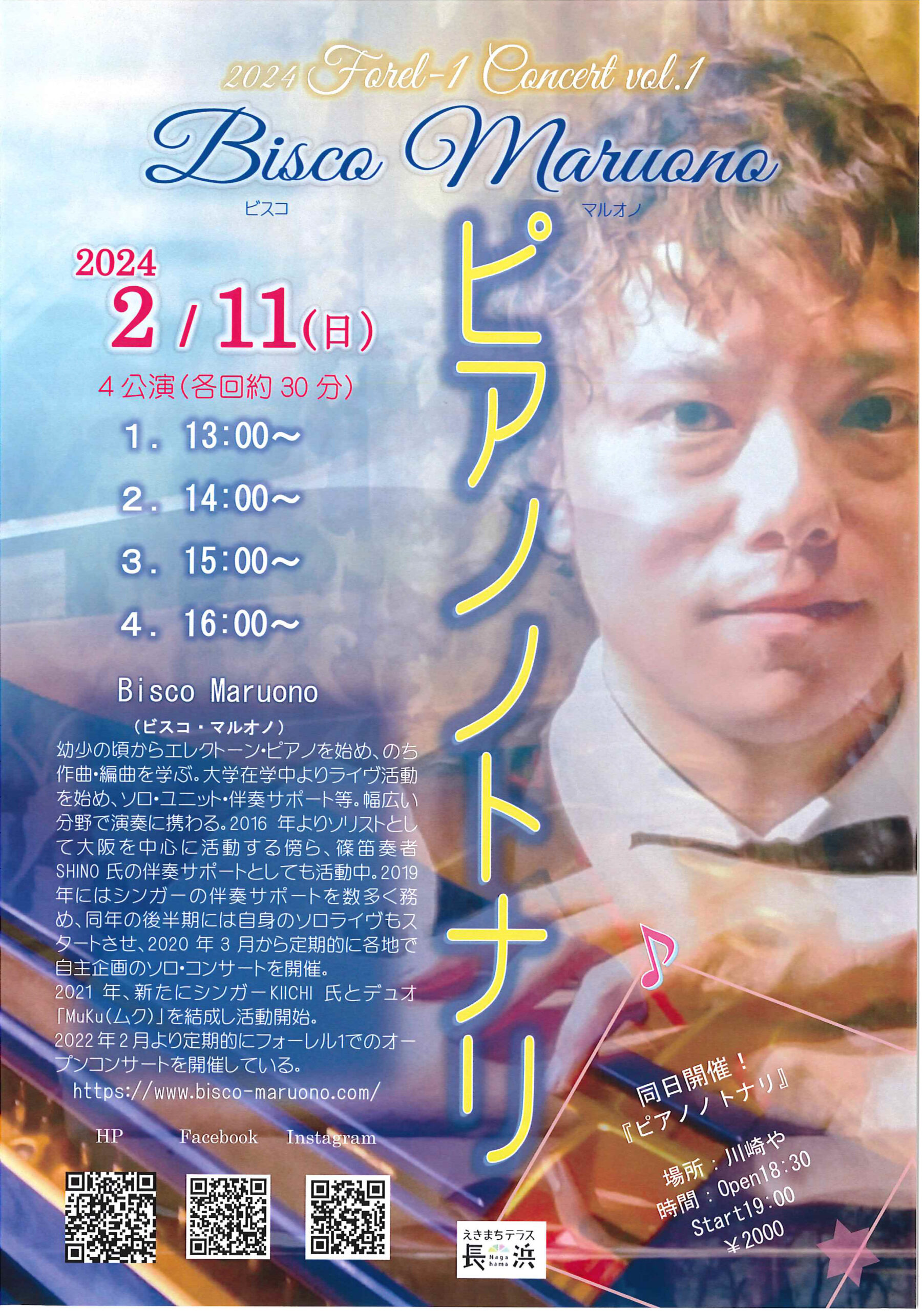 えきまちテラス長浜1階のストリートピアノ「フォーレル1」で、2022年2月より定期的にオープンコンサートを開催されている「ビスコ・マルオノ」さんによるピアノコンサートが開催されます!