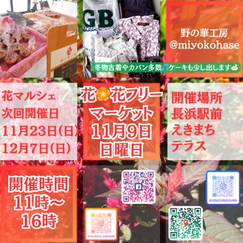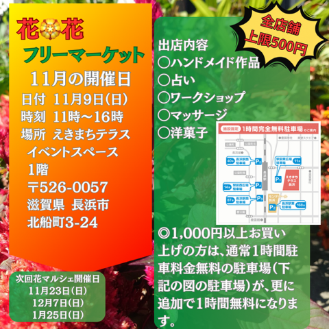 えきまちテラス長浜で毎月1回開催されている「花マルシェ」の新企画「花花フリーマーケット」が11月9日(日)に初めて開催されます!