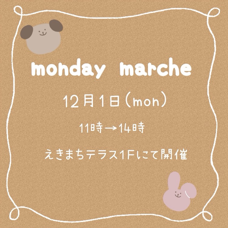 12/1(月) 11:00~14:00 ホームページ:12月1日(月)「monday marche」1年ぶりに開催! Instagram:@monday.marche |