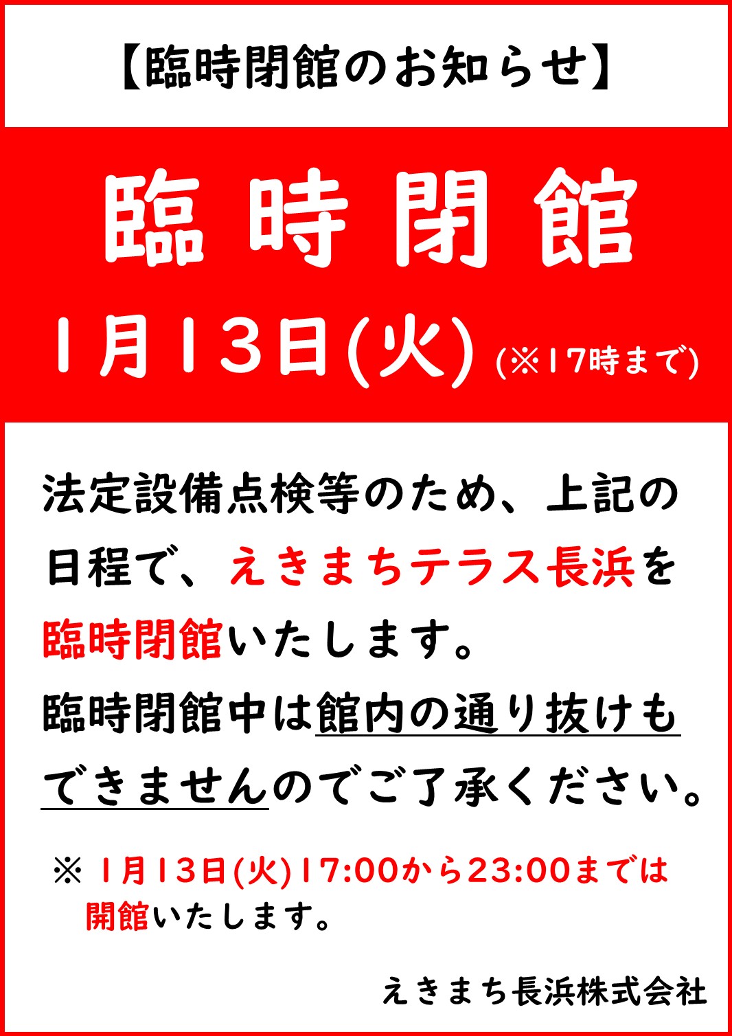 法定設備点検等に伴い、下記日程で、えきまちテラス長浜を臨時閉館いたします。