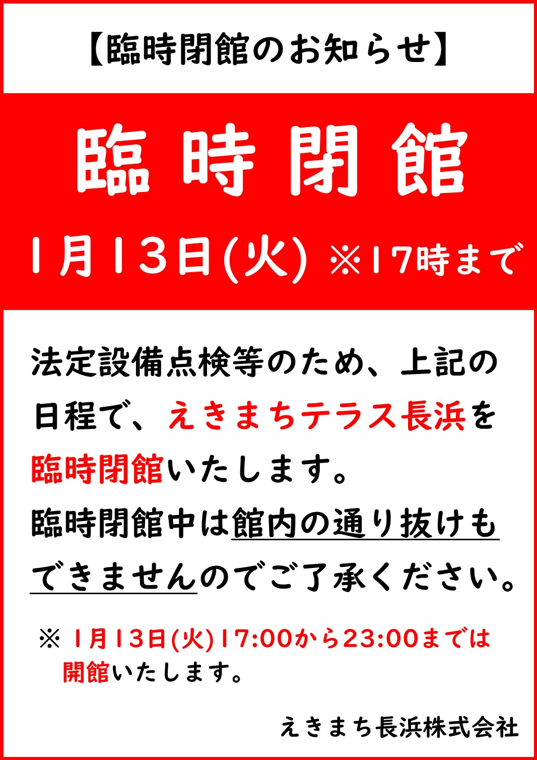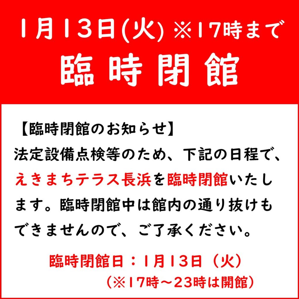 法定設備点検等に伴い、下記日程で、えきまちテラス長浜を臨時閉館いたします。