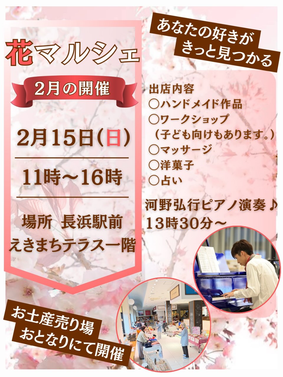 2/15(日) 11:00~16:00 ホームページ:2月15日(日)「花マルシェ」開催! Instagram:@hana.marche_in.nagahama |