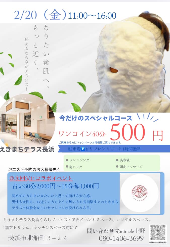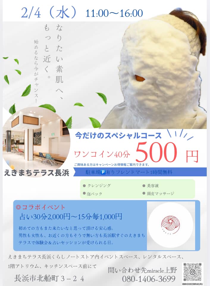 | ミニエステ体験 | 2/4(水)・20(金) 11:00~16:00 Instagram:@miho0802mirakuru |