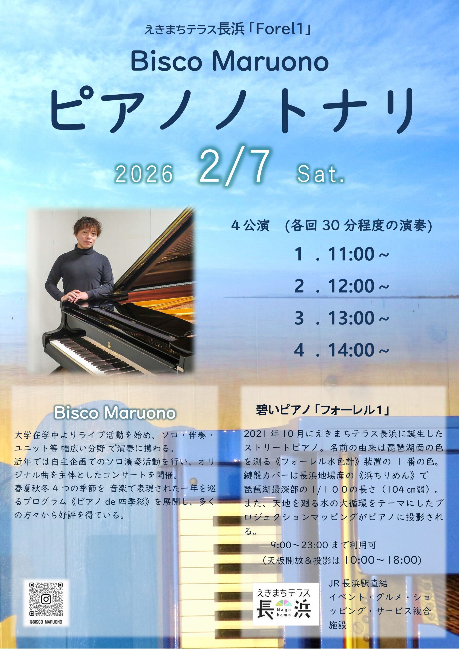 えきまちテラス長浜1階のストリートピアノ「フォーレル1」で、2022年2月より不定期でオープンコンサートを開催されている「ビスコ・マルオノ」さん(@bisco_maruono)によるピアノコンサートが、約1年ぶりに開催されます!
