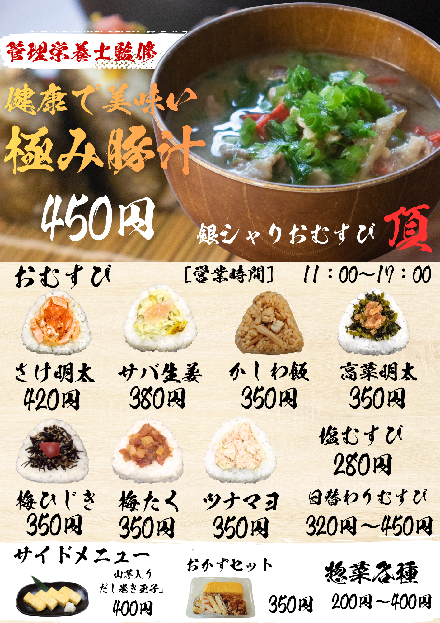 具だくさんのおむすびや管理栄養士監修の具だくさん豚汁、だし巻き玉子などを販売されます。