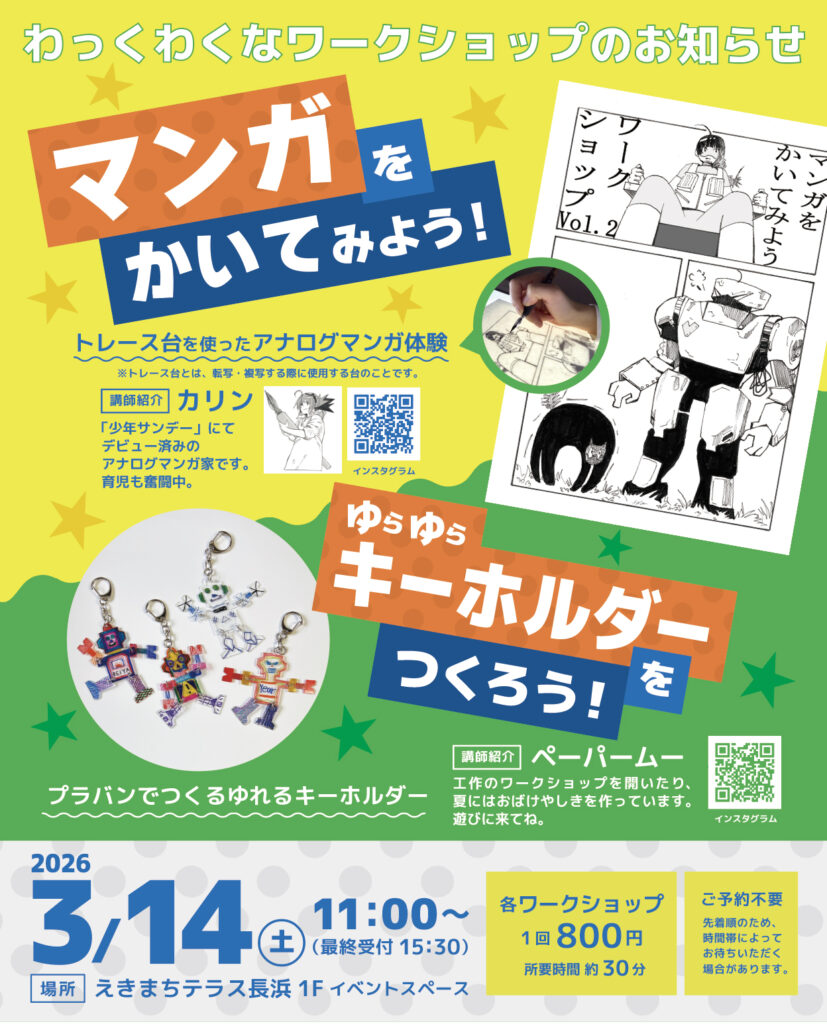 トレース台を使ったアナログマンガ体験とプラバンでつくるゆれるキーホルダーづくりの体験ができますので、ぜひえきまちテラス長浜にお越しください!