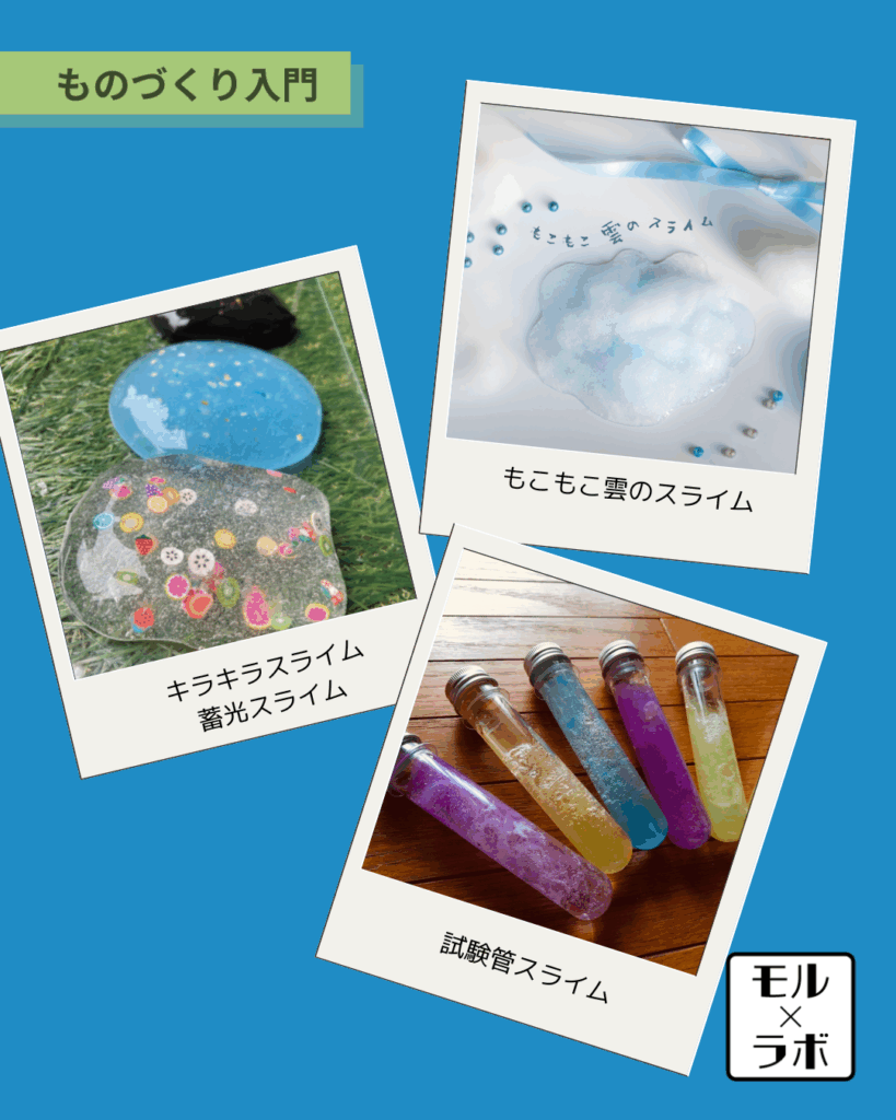・もこもこ雲スライム他、定番のキラキラ映えスライム。スライムで化学反応を体験