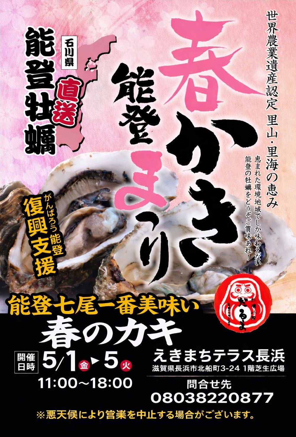| 出張牡蠣小屋だるま~春かき能登まつり~ | 5/1(金)~5(火祝) 11:00~18:00 |